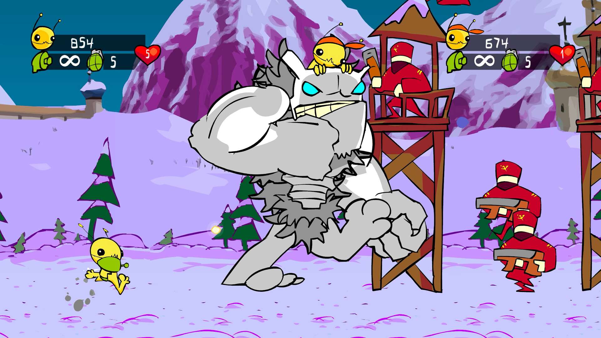 官网自营 动作游戏 2023-11-04 22:37:32 外星原人HD版/Alien Hominid HD 《外星原人HD版》是一款经典的横向卷轴动作射击游戏。玩家扮演一位坠毁在地球的外星人,为了夺回被政府特工抢走的飞碟而展开冒险。游戏核心玩法是快节奏的平台跳跃与双摇杆射击,玩家需在多样的关卡中灵活移动,使用各种武器和手榴弹消灭源源不断的敌人,包括士兵、坦克乃至巨型BOSS。其标志性的卡通渲染风格、夸张的物理效果和充满挑战性的战斗,继承了经典街机游戏的爽快感与高难度,属于典型的动作游戏(ACT)范畴。游戏截图: