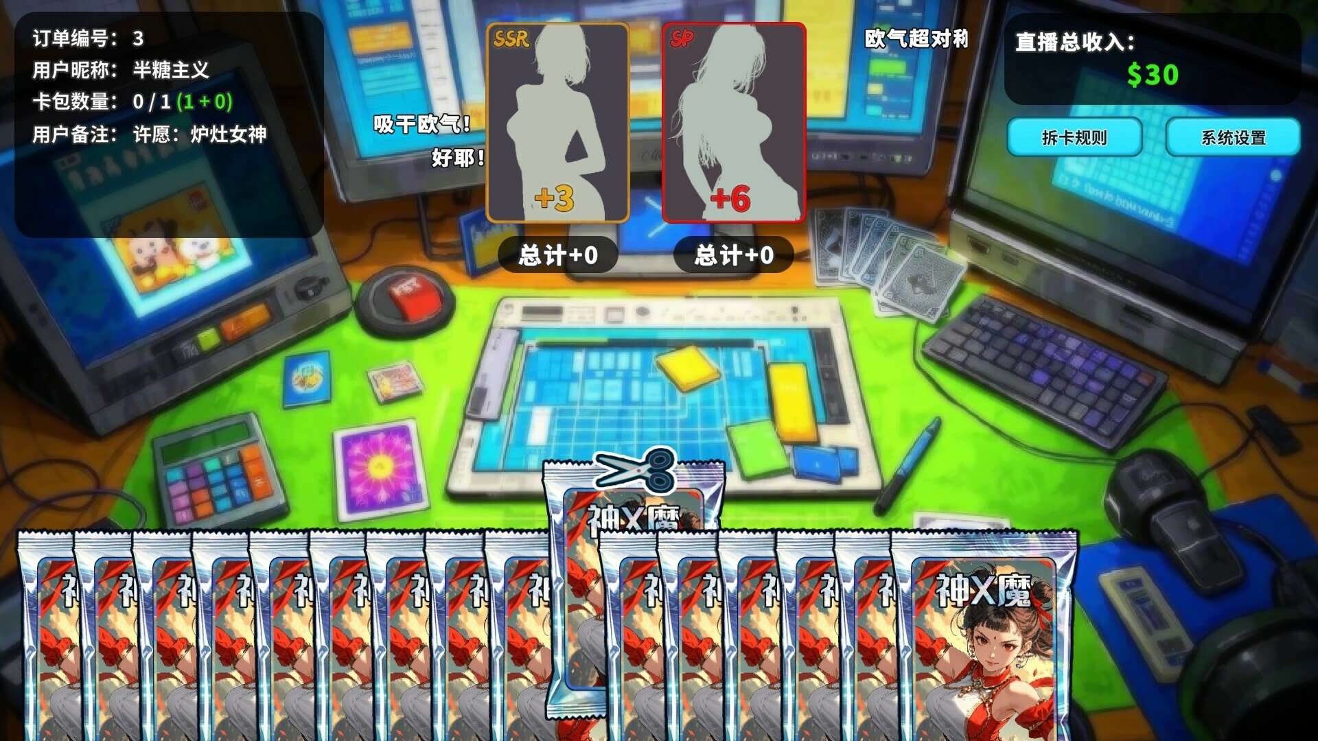 《拆卡模拟器/Card Streamer Simulator》是一款以卡牌收集与交易为核心的模拟策略游戏。玩家将扮演一名卡牌主播,通过直播开卡包、组建卡组、参与线上对战来吸引观众和赚取收益。游戏深度模拟了集换式卡牌市场的经济系统,玩家需要运用策略判断卡牌价值,在合适的时机买入、拆包或出售,以优化自己的收藏并扩大影响力。其核心玩法围绕卡牌构建、资源管理和风险决策展开,符合策略类游戏中“卡牌构建”的典型特征,为玩家提供了兼具运气与策略的模拟经营体验。
