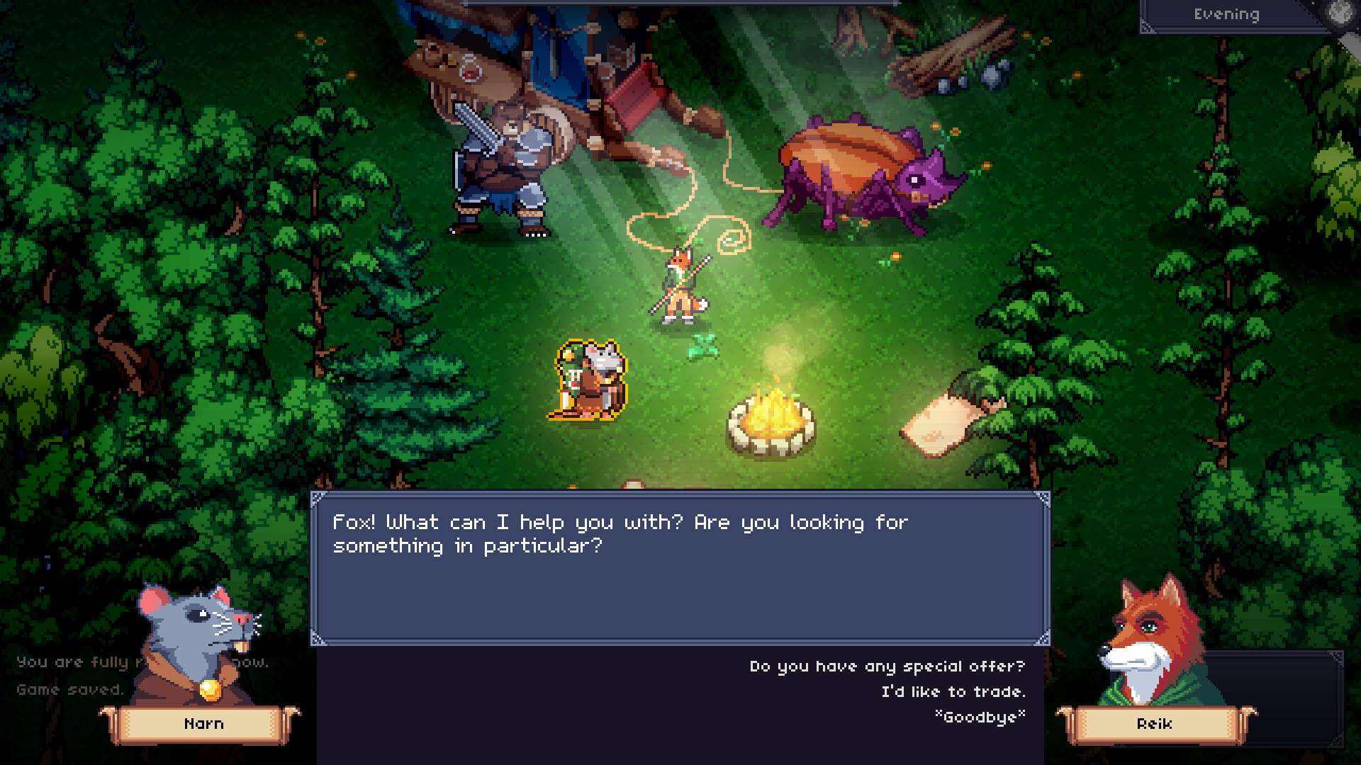 官网自营 角色扮演 2026-01-03 22:36:28 剑与狐尾/Of Blades & Tails 《剑与狐尾》是一款以动物为主角的回合制角色扮演游戏。玩家将扮演一只狐狸,在一个充满剑与魔法的奇幻世界中冒险。游戏采用经典的RPG玩法,包含丰富的角色成长系统、技能树、装备收集和回合制策略战斗。玩家可以探索广阔的世界地图,与各种动物角色互动,接受任务,并揭开世界背后的秘密。其核心体验聚焦于角色扮演、故事推进和策略性的战斗规划,符合角色扮演类游戏的核心特征。游戏截图: