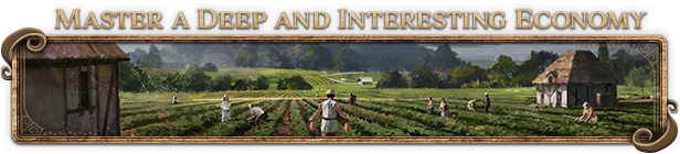掌握深奥有趣的经济系统精心运作经济系统,创造繁荣增长的建造大国。手握基础资源起家,采集食物,赚取财富,开动生产。稳步发展后,可将目光投向研究与改良设施,探索最佳转化路径,将简单货物转化为高价值产品。推动地区生产专门化,将铁熔铸成武器或工具,将木头加工成纸张或木材,将黄金熔铸成金币或首饰。将剩余货物按需求输送至各地,充实帝国粮仓,为广布各地的殖民地与工业腹地运送物质,为驻扎在敌人身侧的部队持续输送补给。